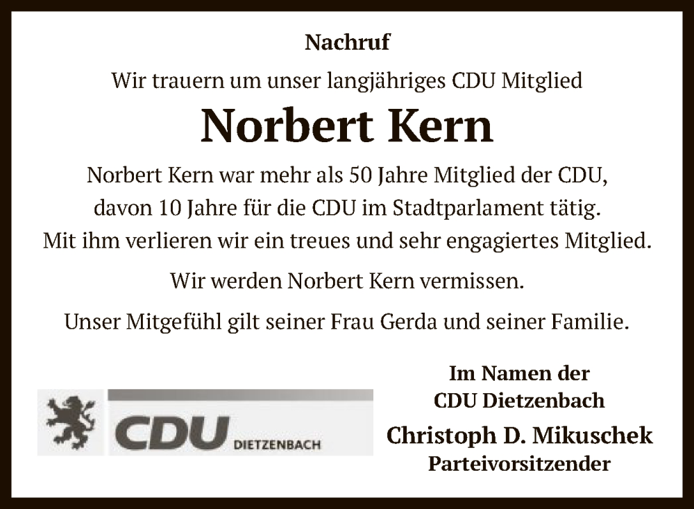 Hier finden Sie alle Traueranzeigen aus der Zeitung, die bisher für Norbert Kern erschienen sind. Weitere Traueranzeigen, die in der Zeitung erscheinen, werden hier ebenfalls aufgelistet