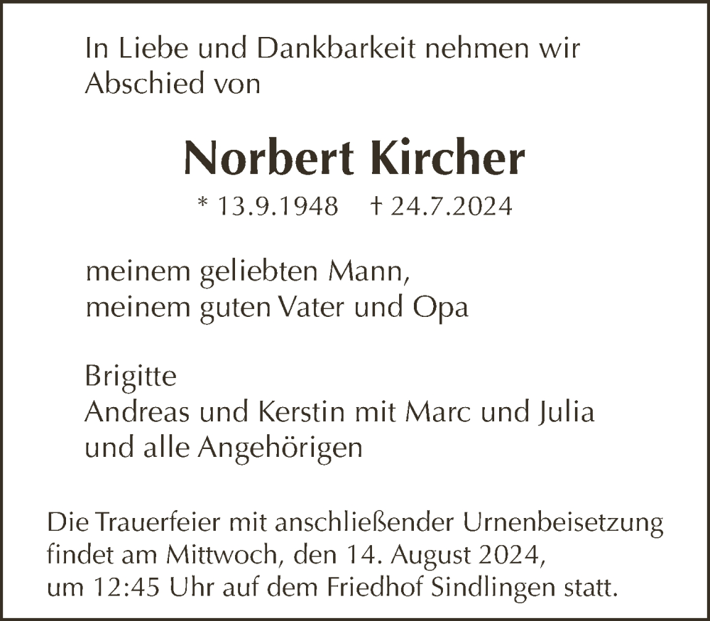 Hier finden Sie alle Traueranzeigen aus der Zeitung, die bisher für Norbert Kircher erschienen sind. Weitere Traueranzeigen, die in der Zeitung erscheinen, werden hier ebenfalls aufgelistet