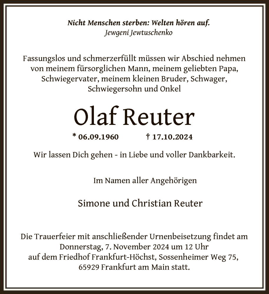 Hier finden Sie alle Traueranzeigen aus der Zeitung, die bisher für Olaf Reuter erschienen sind. Weitere Traueranzeigen, die in der Zeitung erscheinen, werden hier ebenfalls aufgelistet