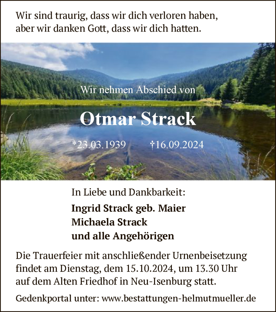 Hier finden Sie alle Traueranzeigen aus der Zeitung, die bisher für Otmar Strack erschienen sind. Weitere Traueranzeigen, die in der Zeitung erscheinen, werden hier ebenfalls aufgelistet
