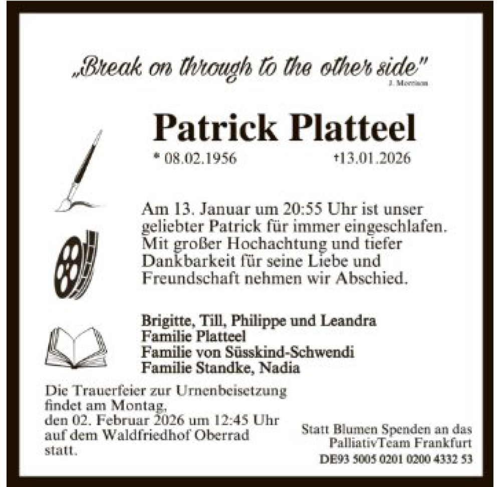 Hier finden Sie alle Traueranzeigen aus der Zeitung, die bisher für Patrick Platteel erschienen sind. Weitere Traueranzeigen, die in der Zeitung erscheinen, werden hier ebenfalls aufgelistet