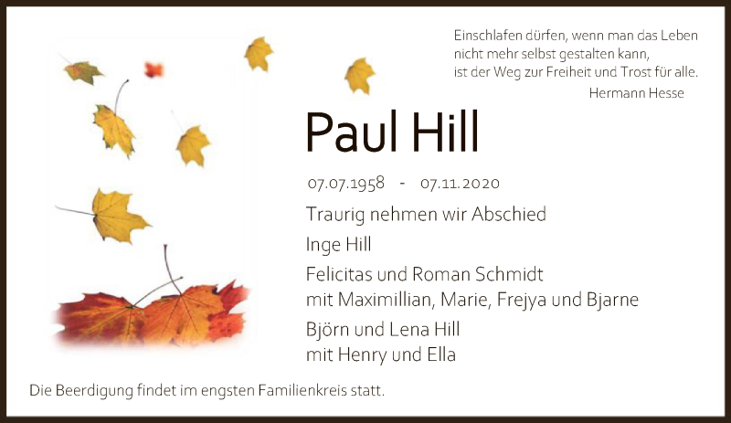 Hier finden Sie alle Traueranzeigen aus der Zeitung, die bisher für Paul Hill erschienen sind. Weitere Traueranzeigen, die in der Zeitung erscheinen, werden hier ebenfalls aufgelistet