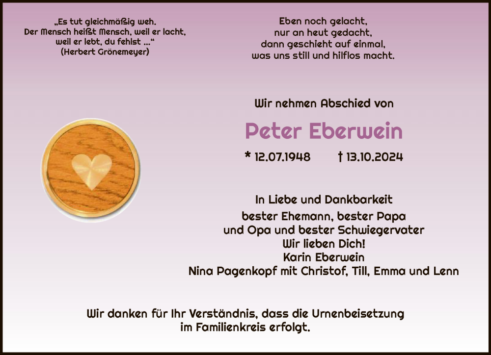 Hier finden Sie alle Traueranzeigen aus der Zeitung, die bisher für Peter Eberwein erschienen sind. Weitere Traueranzeigen, die in der Zeitung erscheinen, werden hier ebenfalls aufgelistet