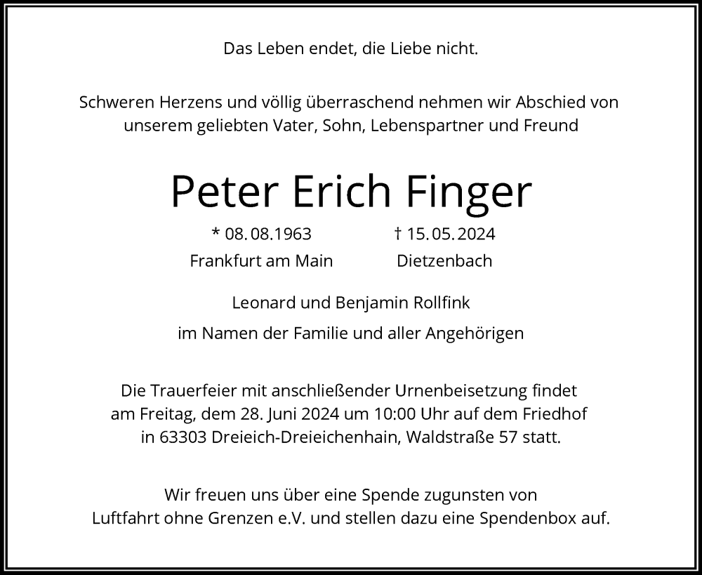 Hier finden Sie alle Traueranzeigen aus der Zeitung, die bisher für Peter Erich Finger erschienen sind. Weitere Traueranzeigen, die in der Zeitung erscheinen, werden hier ebenfalls aufgelistet