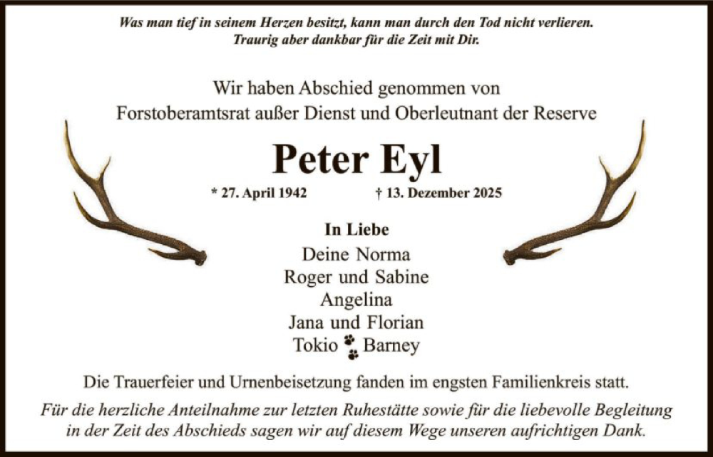 Hier finden Sie alle Traueranzeigen aus der Zeitung, die bisher für Peter Eyl erschienen sind. Weitere Traueranzeigen, die in der Zeitung erscheinen, werden hier ebenfalls aufgelistet