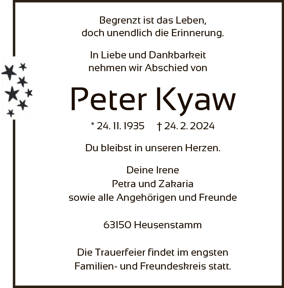 Hier finden Sie alle Traueranzeigen aus der Zeitung, die bisher für Peter Kyaw erschienen sind. Weitere Traueranzeigen, die in der Zeitung erscheinen, werden hier ebenfalls aufgelistet