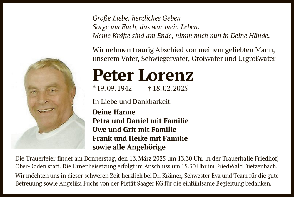 Hier finden Sie alle Traueranzeigen aus der Zeitung, die bisher für Peter Lorenz erschienen sind. Weitere Traueranzeigen, die in der Zeitung erscheinen, werden hier ebenfalls aufgelistet