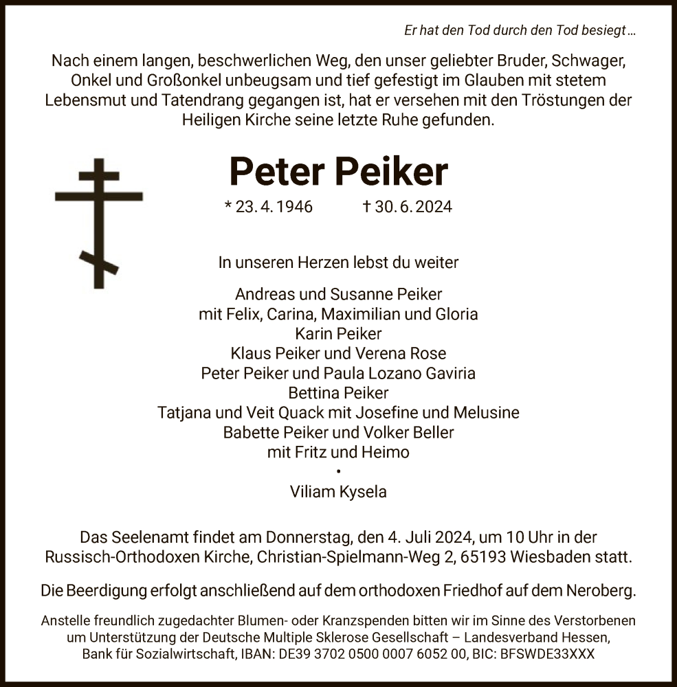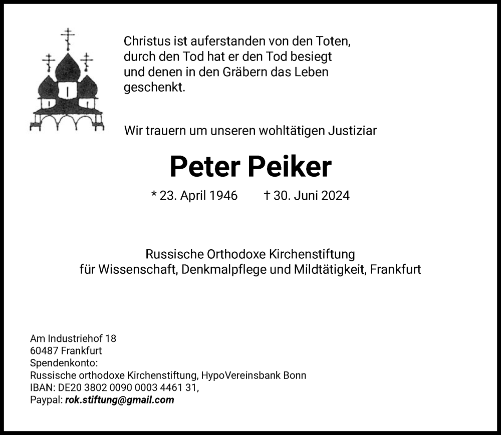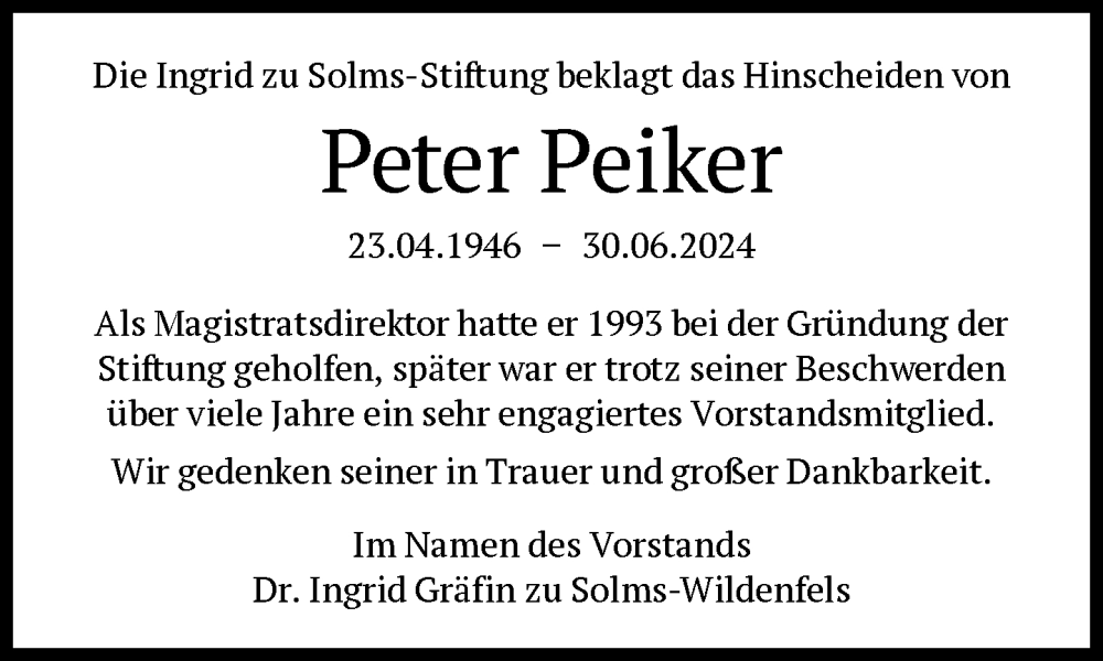 Hier finden Sie alle Traueranzeigen aus der Zeitung, die bisher für Peter Peiker erschienen sind. Weitere Traueranzeigen, die in der Zeitung erscheinen, werden hier ebenfalls aufgelistet
