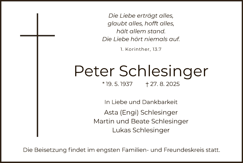 Hier finden Sie alle Traueranzeigen aus der Zeitung, die bisher für Peter Schlesinger erschienen sind. Weitere Traueranzeigen, die in der Zeitung erscheinen, werden hier ebenfalls aufgelistet