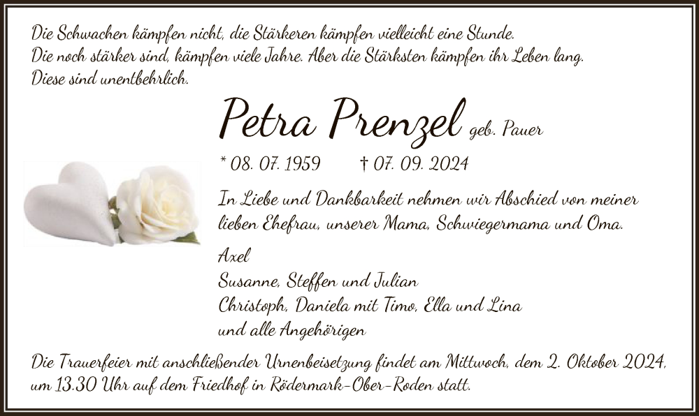 Hier finden Sie alle Traueranzeigen aus der Zeitung, die bisher für Petra Prenzel erschienen sind. Weitere Traueranzeigen, die in der Zeitung erscheinen, werden hier ebenfalls aufgelistet
