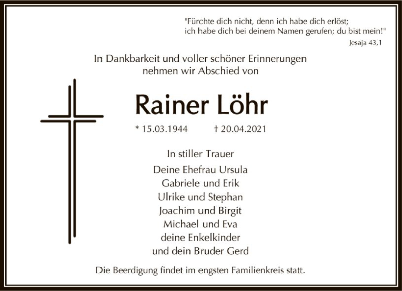 Hier finden Sie alle Traueranzeigen aus der Zeitung, die bisher für Rainer Löhr erschienen sind. Weitere Traueranzeigen, die in der Zeitung erscheinen, werden hier ebenfalls aufgelistet