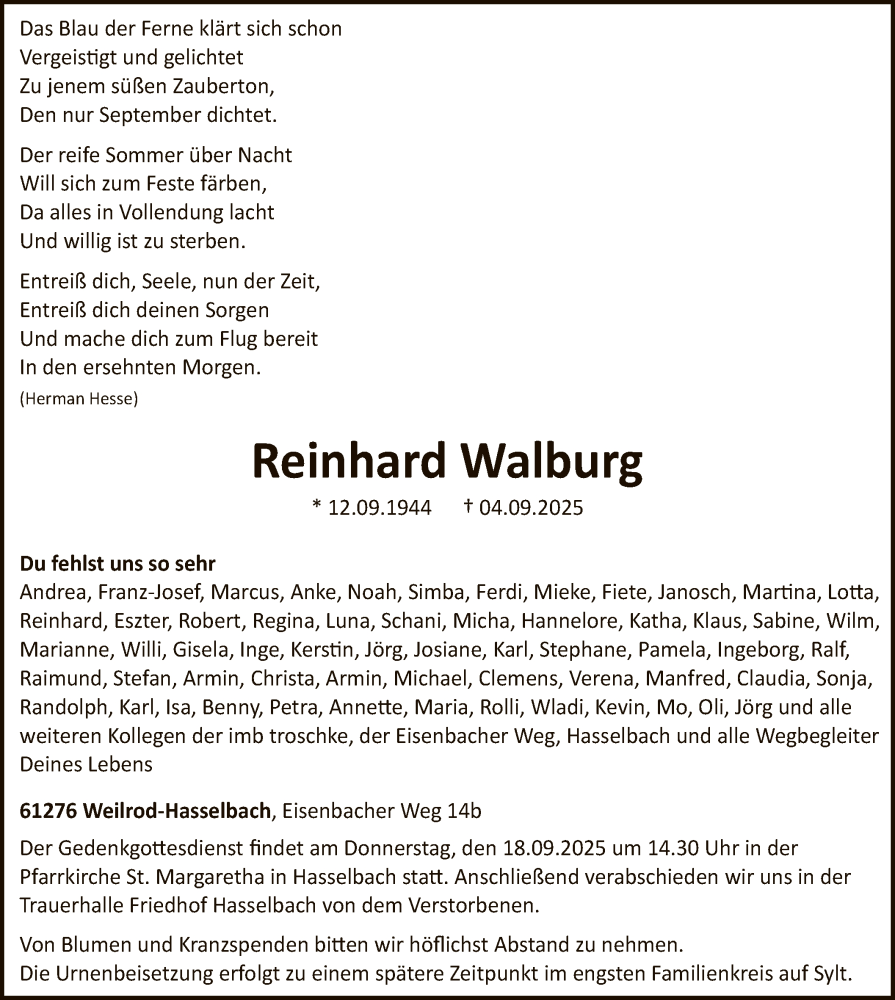 Hier finden Sie alle Traueranzeigen aus der Zeitung, die bisher für Reinhard Walburg erschienen sind. Weitere Traueranzeigen, die in der Zeitung erscheinen, werden hier ebenfalls aufgelistet