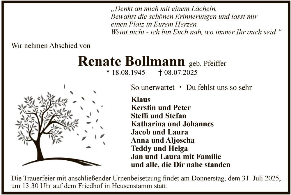 Hier finden Sie alle Traueranzeigen aus der Zeitung, die bisher für Renate Bollmann erschienen sind. Weitere Traueranzeigen, die in der Zeitung erscheinen, werden hier ebenfalls aufgelistet