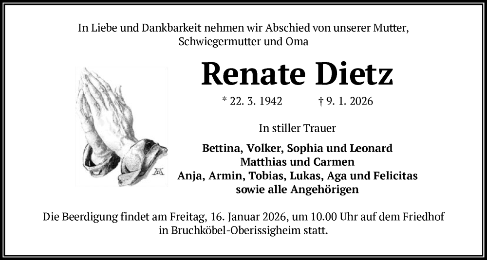 Hier finden Sie alle Traueranzeigen aus der Zeitung, die bisher für Renate Dietz erschienen sind. Weitere Traueranzeigen, die in der Zeitung erscheinen, werden hier ebenfalls aufgelistet