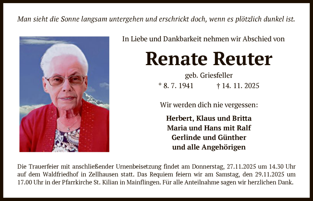 Hier finden Sie alle Traueranzeigen aus der Zeitung, die bisher für Renate Reuter erschienen sind. Weitere Traueranzeigen, die in der Zeitung erscheinen, werden hier ebenfalls aufgelistet