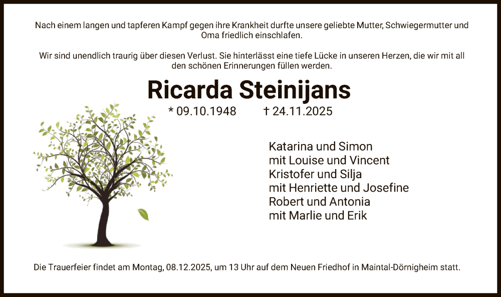 Hier finden Sie alle Traueranzeigen aus der Zeitung, die bisher für Ricarda Steinijans erschienen sind. Weitere Traueranzeigen, die in der Zeitung erscheinen, werden hier ebenfalls aufgelistet