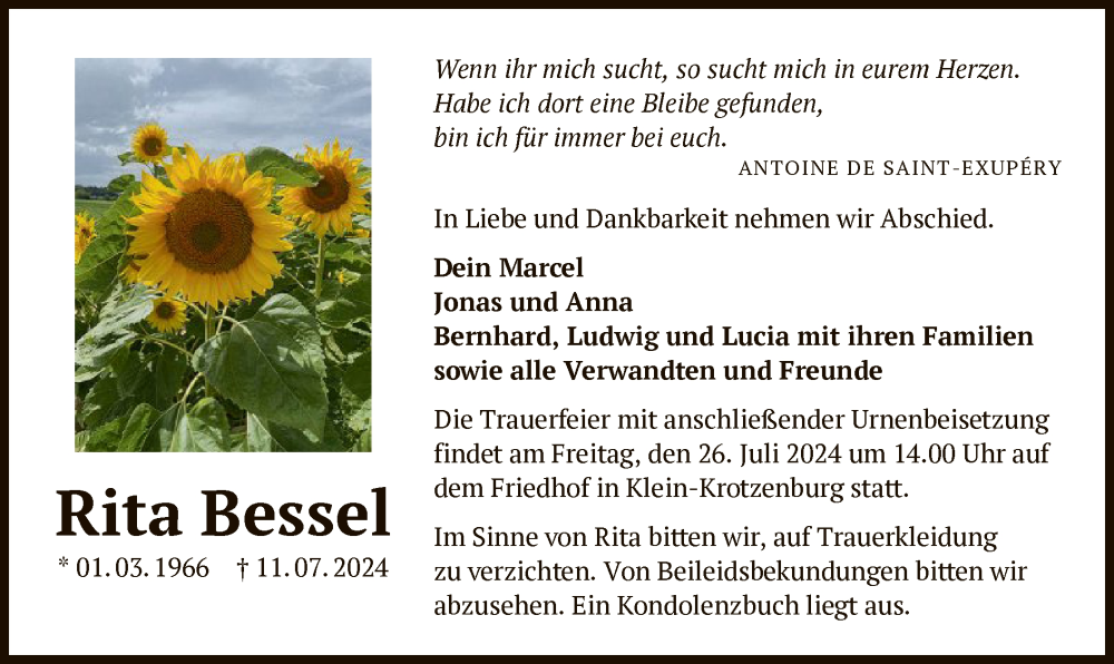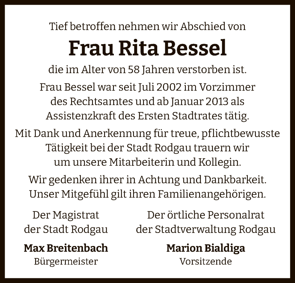Hier finden Sie alle Traueranzeigen aus der Zeitung, die bisher für Rita Bessel erschienen sind. Weitere Traueranzeigen, die in der Zeitung erscheinen, werden hier ebenfalls aufgelistet