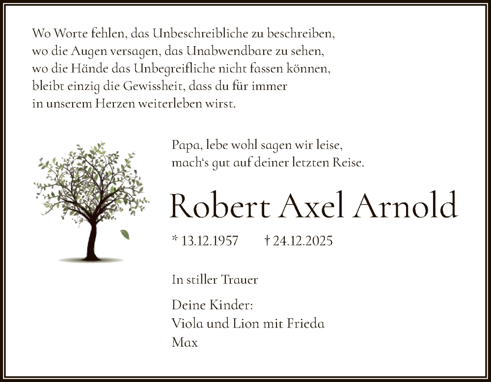 Hier finden Sie alle Traueranzeigen aus der Zeitung, die bisher für Robert Axel Arnold erschienen sind. Weitere Traueranzeigen, die in der Zeitung erscheinen, werden hier ebenfalls aufgelistet