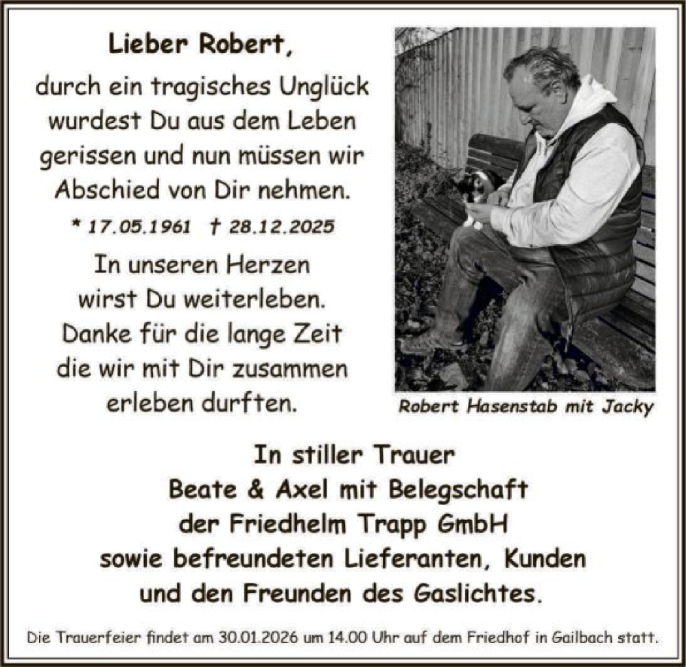 Hier finden Sie alle Traueranzeigen aus der Zeitung, die bisher für Robert Hasenstab erschienen sind. Weitere Traueranzeigen, die in der Zeitung erscheinen, werden hier ebenfalls aufgelistet