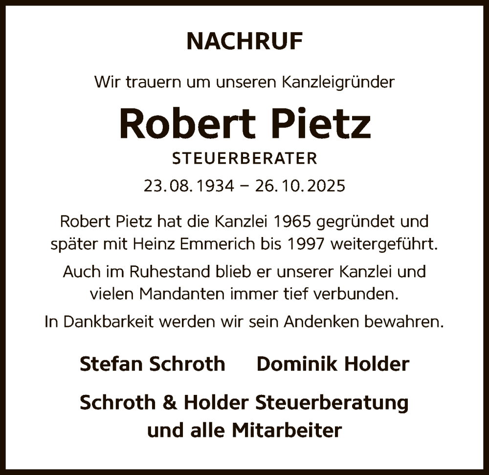 Hier finden Sie alle Traueranzeigen aus der Zeitung, die bisher für Robert Pietz erschienen sind. Weitere Traueranzeigen, die in der Zeitung erscheinen, werden hier ebenfalls aufgelistet