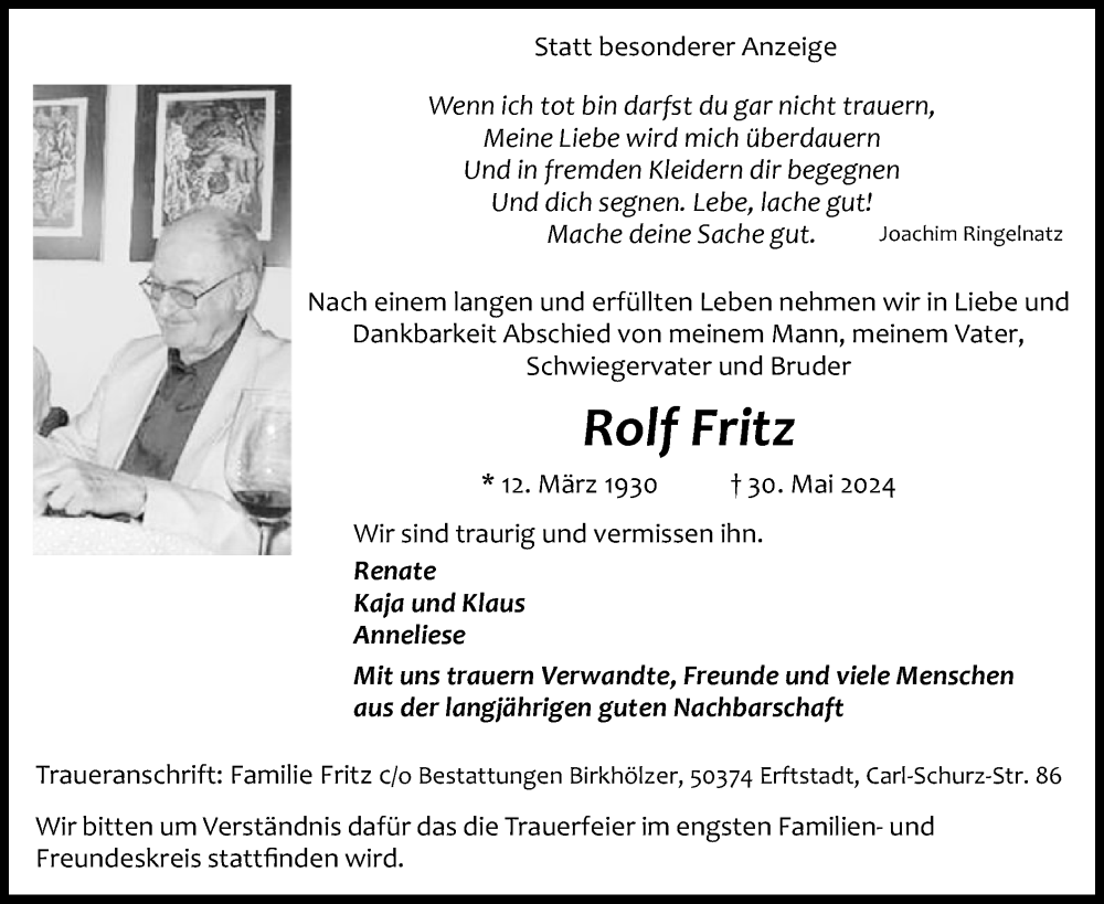 Hier finden Sie alle Traueranzeigen aus der Zeitung, die bisher für Rolf Fritz erschienen sind. Weitere Traueranzeigen, die in der Zeitung erscheinen, werden hier ebenfalls aufgelistet