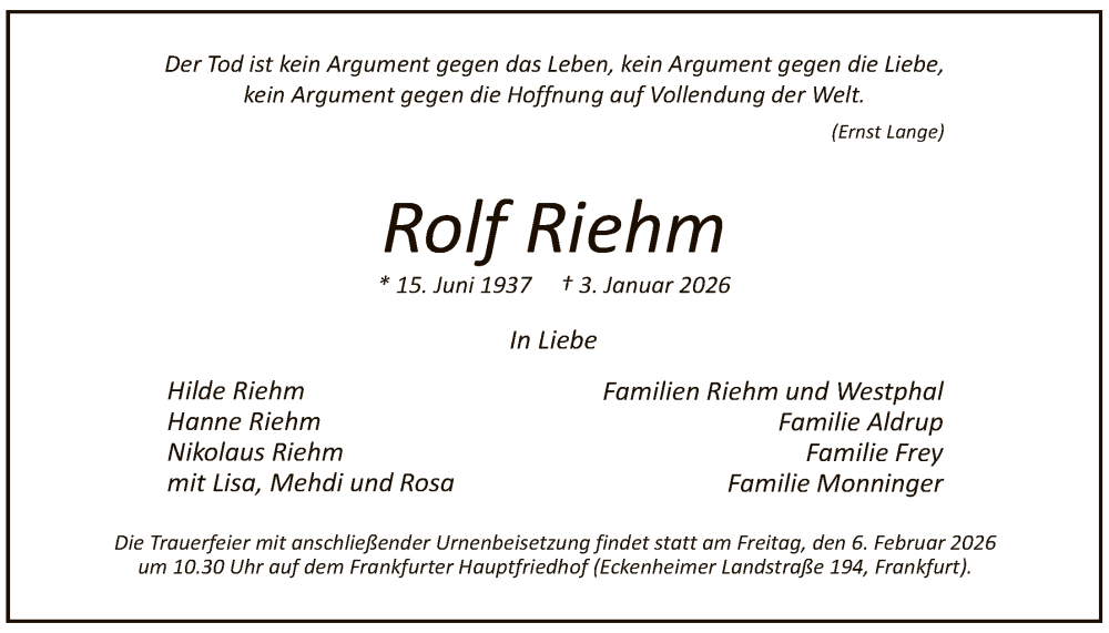 Hier finden Sie alle Traueranzeigen aus der Zeitung, die bisher für Rolf Riehm erschienen sind. Weitere Traueranzeigen, die in der Zeitung erscheinen, werden hier ebenfalls aufgelistet