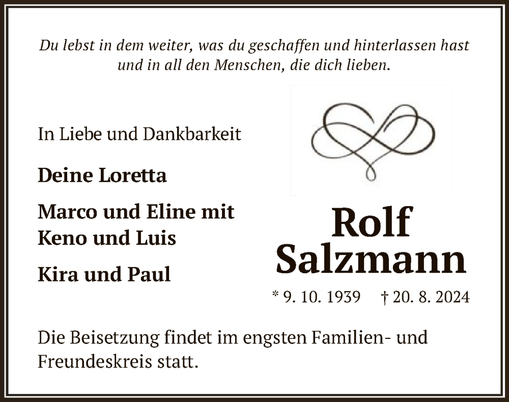 Hier finden Sie alle Traueranzeigen aus der Zeitung, die bisher für Rolf Salzmann erschienen sind. Weitere Traueranzeigen, die in der Zeitung erscheinen, werden hier ebenfalls aufgelistet