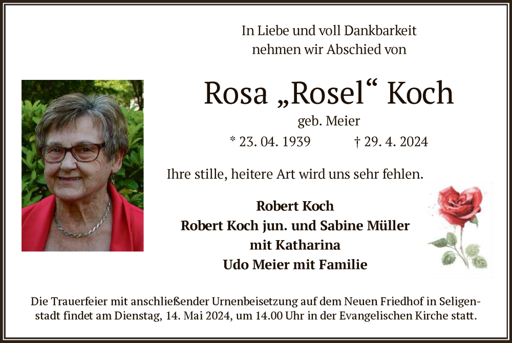 Hier finden Sie alle Traueranzeigen aus der Zeitung, die bisher für Rosa Koch erschienen sind. Weitere Traueranzeigen, die in der Zeitung erscheinen, werden hier ebenfalls aufgelistet