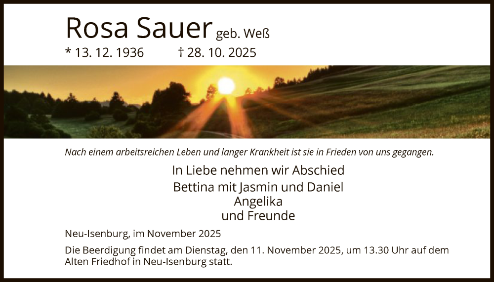 Hier finden Sie alle Traueranzeigen aus der Zeitung, die bisher für Rosa Sauer erschienen sind. Weitere Traueranzeigen, die in der Zeitung erscheinen, werden hier ebenfalls aufgelistet