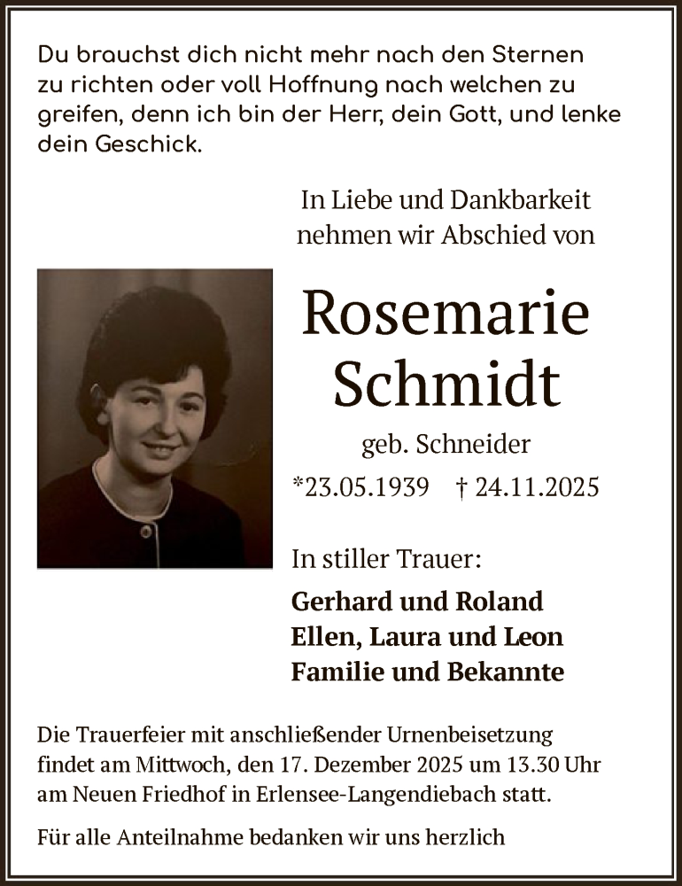 Hier finden Sie alle Traueranzeigen aus der Zeitung, die bisher für Rosemarie Schmidt erschienen sind. Weitere Traueranzeigen, die in der Zeitung erscheinen, werden hier ebenfalls aufgelistet