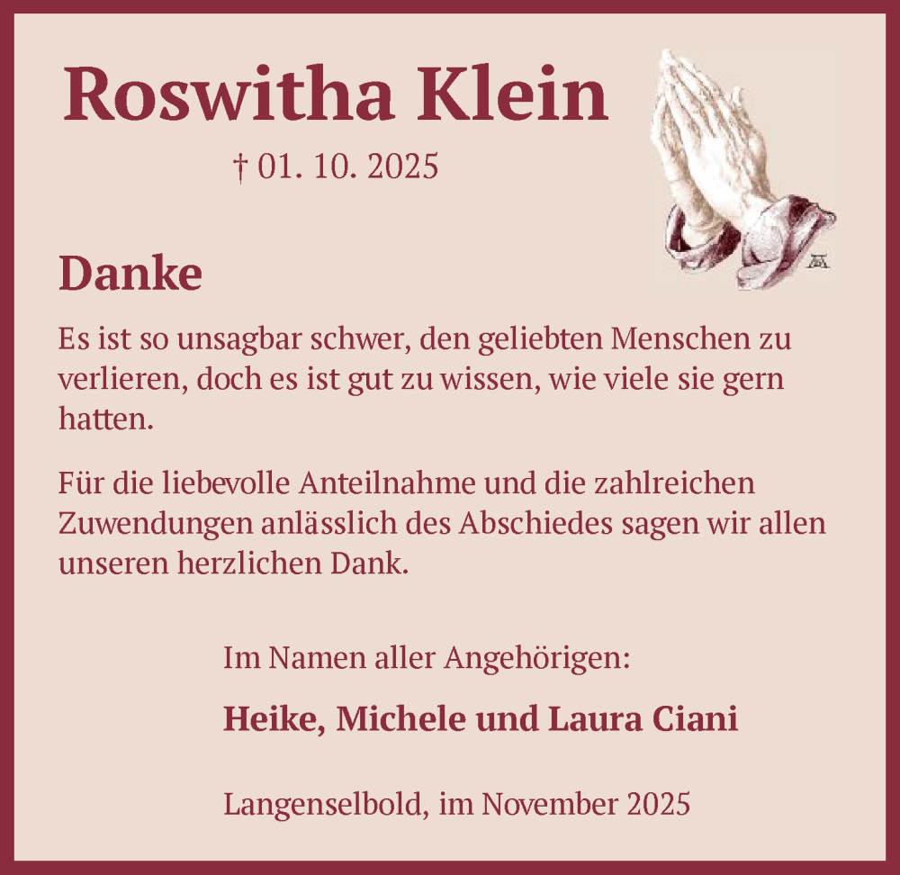 Hier finden Sie alle Traueranzeigen aus der Zeitung, die bisher für Roswitha Klein erschienen sind. Weitere Traueranzeigen, die in der Zeitung erscheinen, werden hier ebenfalls aufgelistet