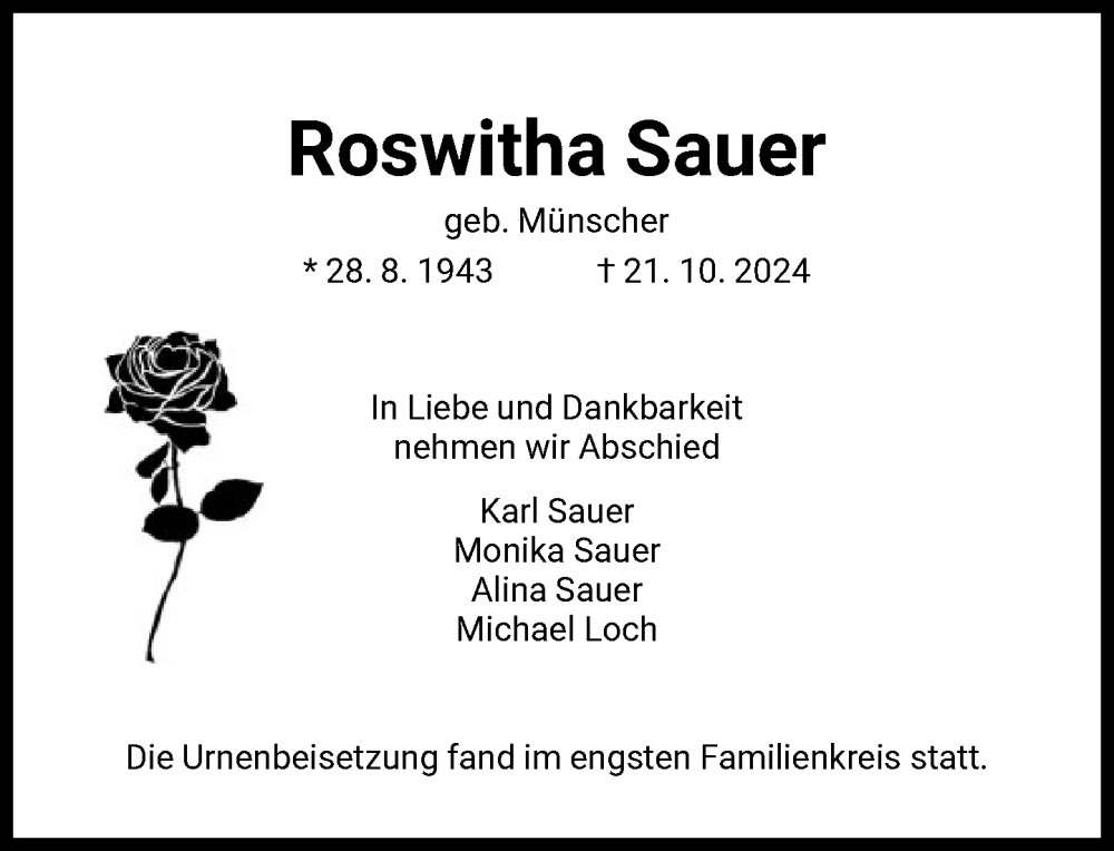 Hier finden Sie alle Traueranzeigen aus der Zeitung, die bisher für Roswitha Sauer erschienen sind. Weitere Traueranzeigen, die in der Zeitung erscheinen, werden hier ebenfalls aufgelistet