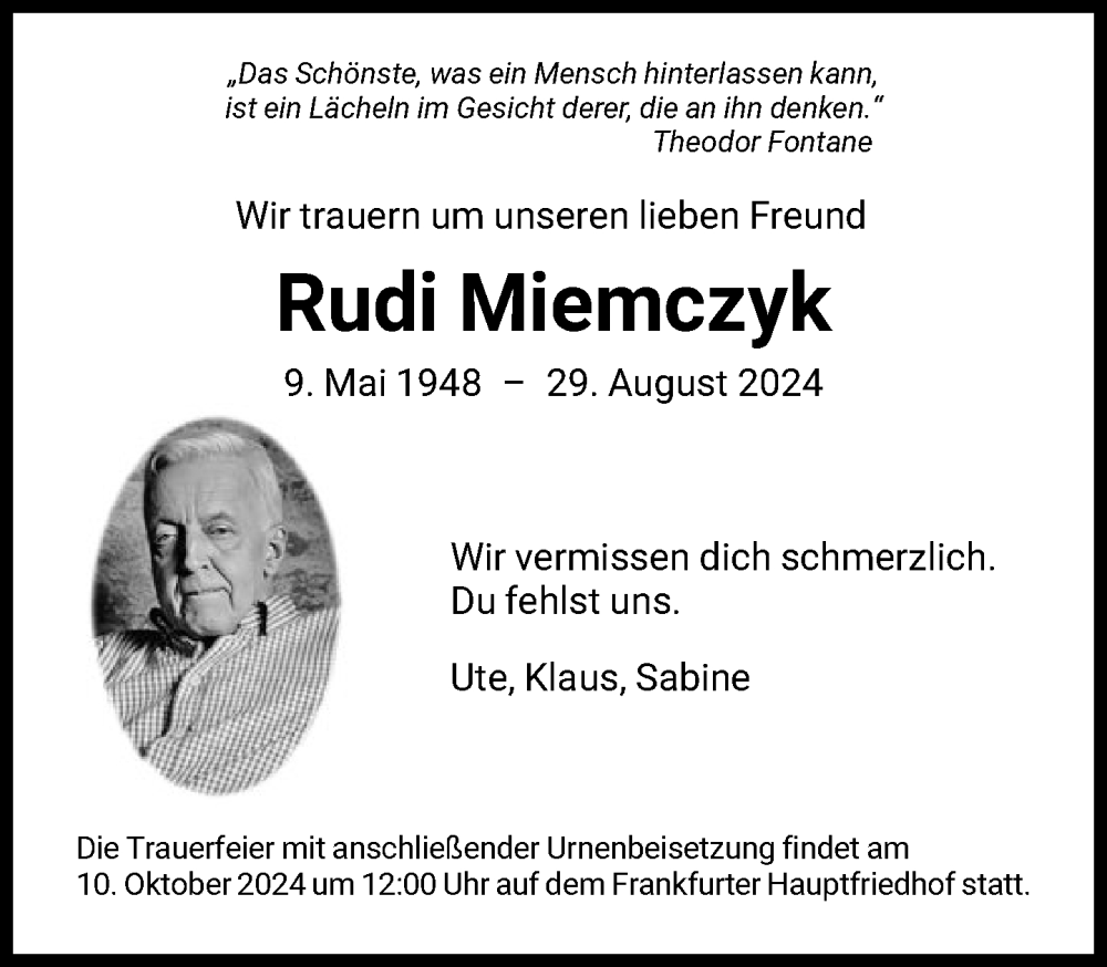 Hier finden Sie alle Traueranzeigen aus der Zeitung, die bisher für Rudi Miemcyk erschienen sind. Weitere Traueranzeigen, die in der Zeitung erscheinen, werden hier ebenfalls aufgelistet