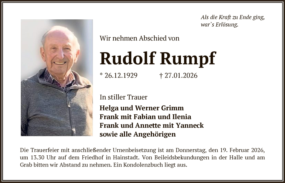 Hier finden Sie alle Traueranzeigen aus der Zeitung, die bisher für Rudolf Rumpf erschienen sind. Weitere Traueranzeigen, die in der Zeitung erscheinen, werden hier ebenfalls aufgelistet
