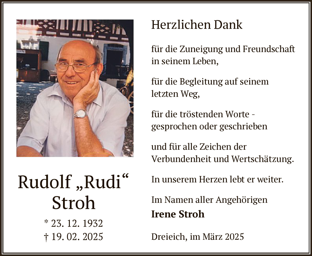 Hier finden Sie alle Traueranzeigen aus der Zeitung, die bisher für Rudolf Stroh erschienen sind. Weitere Traueranzeigen, die in der Zeitung erscheinen, werden hier ebenfalls aufgelistet