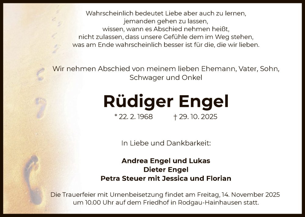Hier finden Sie alle Traueranzeigen aus der Zeitung, die bisher für Rüdiger Engel erschienen sind. Weitere Traueranzeigen, die in der Zeitung erscheinen, werden hier ebenfalls aufgelistet