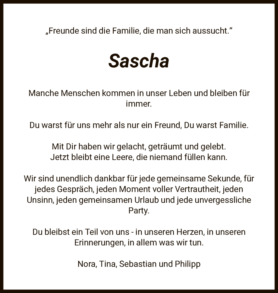 Hier finden Sie alle Traueranzeigen aus der Zeitung, die bisher für Sascha Becker erschienen sind. Weitere Traueranzeigen, die in der Zeitung erscheinen, werden hier ebenfalls aufgelistet