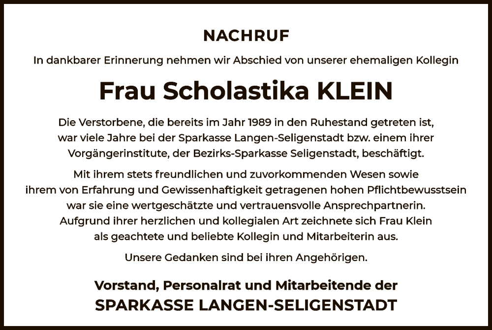 Hier finden Sie alle Traueranzeigen aus der Zeitung, die bisher für Scholastika Klein erschienen sind. Weitere Traueranzeigen, die in der Zeitung erscheinen, werden hier ebenfalls aufgelistet