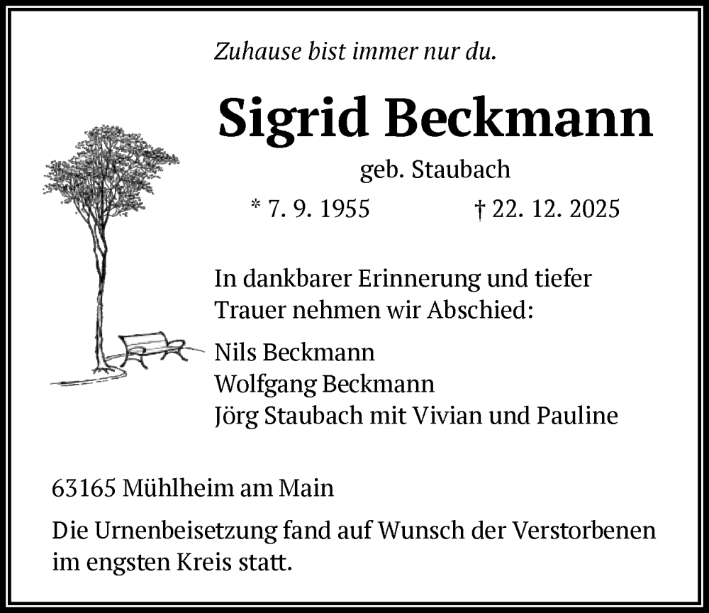 Hier finden Sie alle Traueranzeigen aus der Zeitung, die bisher für Sigrid Beckmann erschienen sind. Weitere Traueranzeigen, die in der Zeitung erscheinen, werden hier ebenfalls aufgelistet