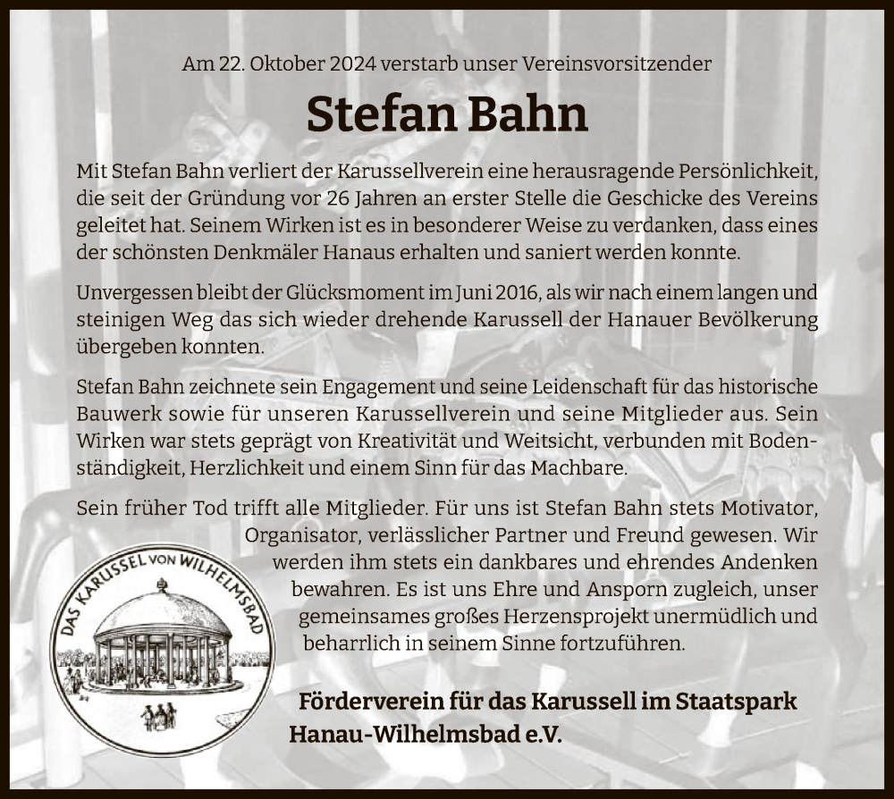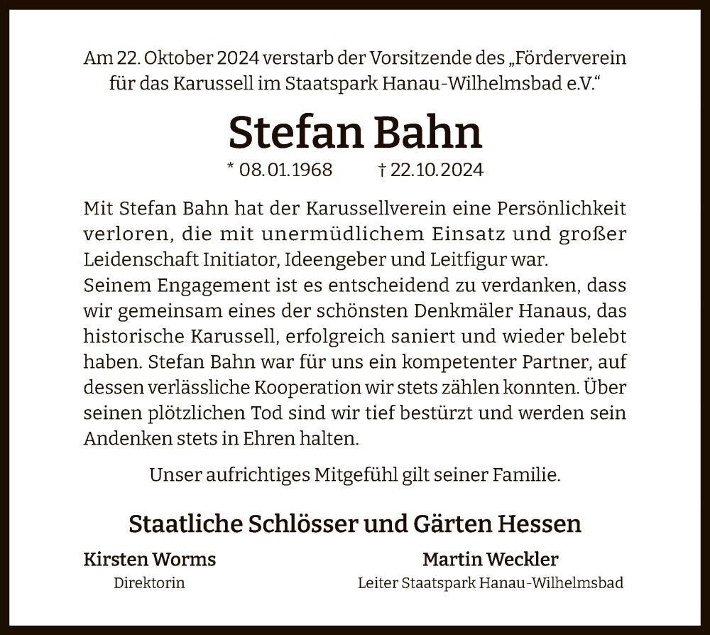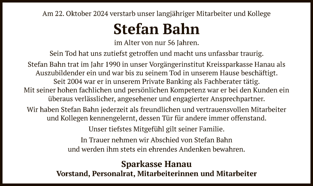 Hier finden Sie alle Traueranzeigen aus der Zeitung, die bisher für Stefan Bahn erschienen sind. Weitere Traueranzeigen, die in der Zeitung erscheinen, werden hier ebenfalls aufgelistet