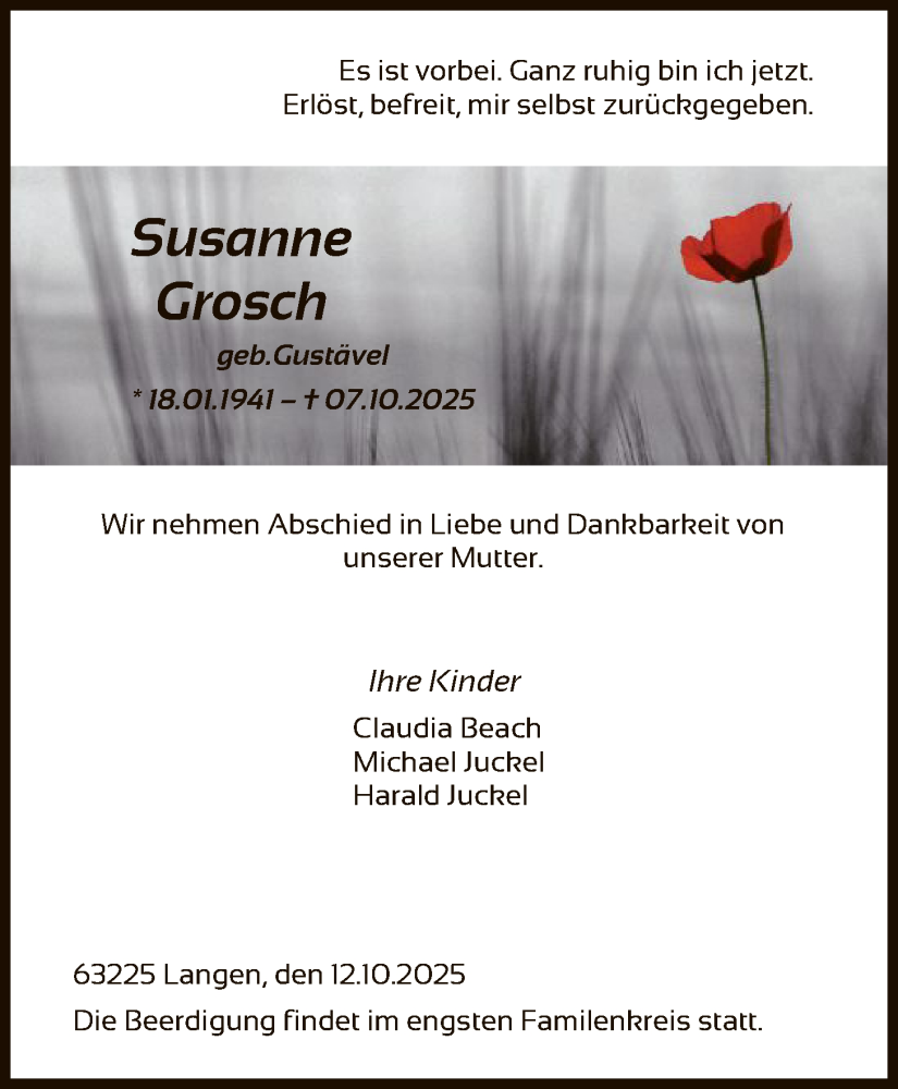 Hier finden Sie alle Traueranzeigen aus der Zeitung, die bisher für Susanne Grosch erschienen sind. Weitere Traueranzeigen, die in der Zeitung erscheinen, werden hier ebenfalls aufgelistet