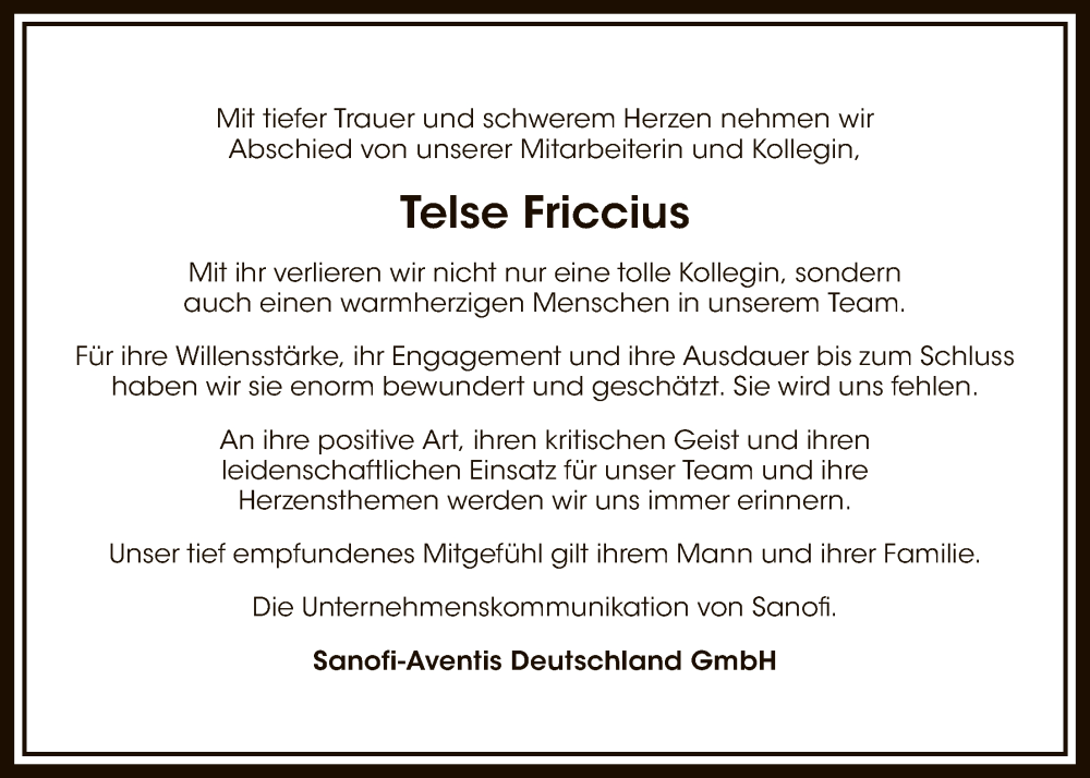 Hier finden Sie alle Traueranzeigen aus der Zeitung, die bisher für Telse Friccius erschienen sind. Weitere Traueranzeigen, die in der Zeitung erscheinen, werden hier ebenfalls aufgelistet