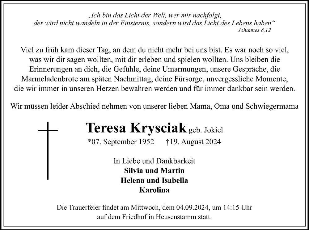 Hier finden Sie alle Traueranzeigen aus der Zeitung, die bisher für Teresa Krysciak erschienen sind. Weitere Traueranzeigen, die in der Zeitung erscheinen, werden hier ebenfalls aufgelistet