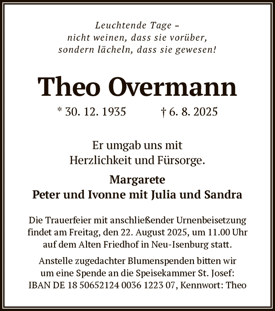 Hier finden Sie alle Traueranzeigen aus der Zeitung, die bisher für Theo Overmann erschienen sind. Weitere Traueranzeigen, die in der Zeitung erscheinen, werden hier ebenfalls aufgelistet
