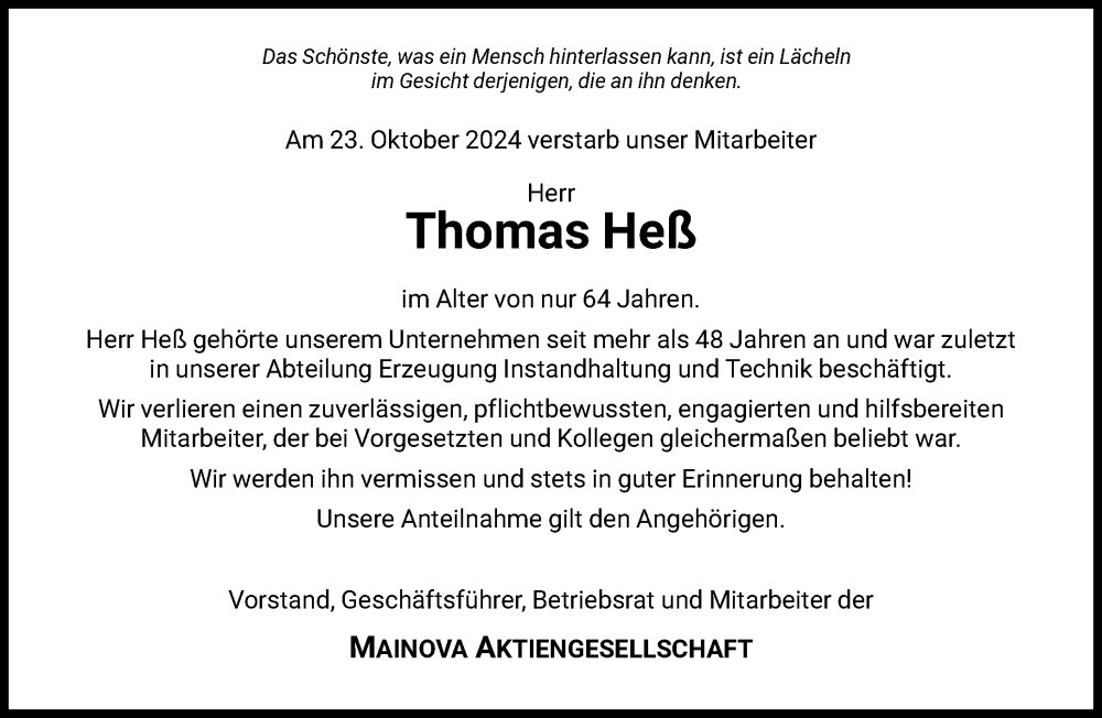 Hier finden Sie alle Traueranzeigen aus der Zeitung, die bisher für Thomas Heß erschienen sind. Weitere Traueranzeigen, die in der Zeitung erscheinen, werden hier ebenfalls aufgelistet