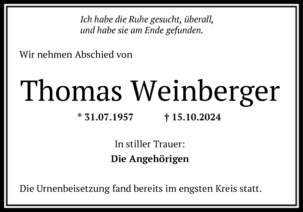 Hier finden Sie alle Traueranzeigen aus der Zeitung, die bisher für Thomas Weinberger erschienen sind. Weitere Traueranzeigen, die in der Zeitung erscheinen, werden hier ebenfalls aufgelistet