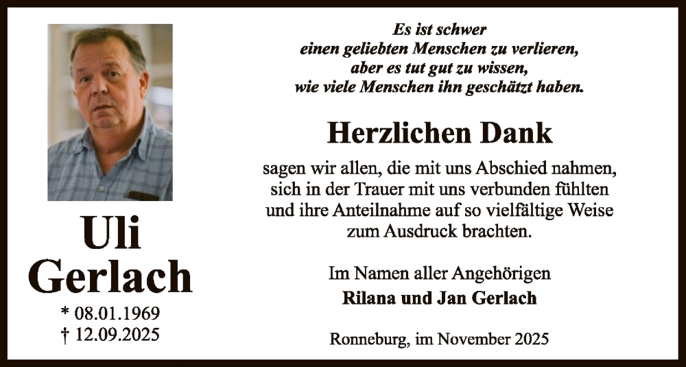 Hier finden Sie alle Traueranzeigen aus der Zeitung, die bisher für Uli Gerlach erschienen sind. Weitere Traueranzeigen, die in der Zeitung erscheinen, werden hier ebenfalls aufgelistet