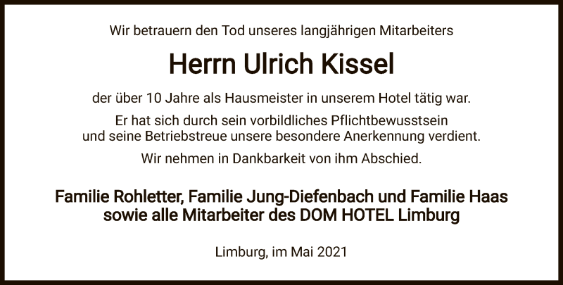 Hier finden Sie alle Traueranzeigen aus der Zeitung, die bisher für Ulrich Kissel erschienen sind. Weitere Traueranzeigen, die in der Zeitung erscheinen, werden hier ebenfalls aufgelistet