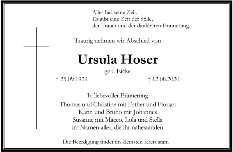 Hier finden Sie alle Traueranzeigen aus der Zeitung, die bisher für Ursula Hoser erschienen sind. Weitere Traueranzeigen, die in der Zeitung erscheinen, werden hier ebenfalls aufgelistet
