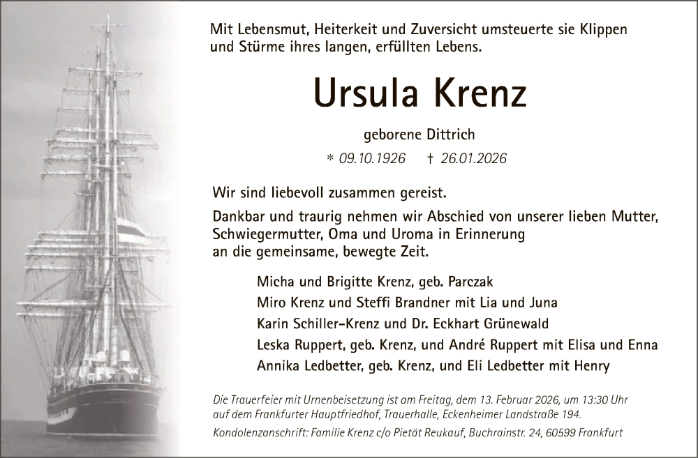 Hier finden Sie alle Traueranzeigen aus der Zeitung, die bisher für Ursula Krenz erschienen sind. Weitere Traueranzeigen, die in der Zeitung erscheinen, werden hier ebenfalls aufgelistet
